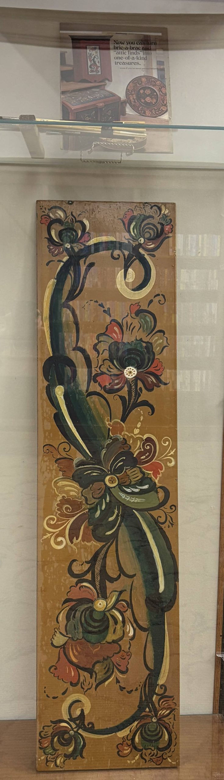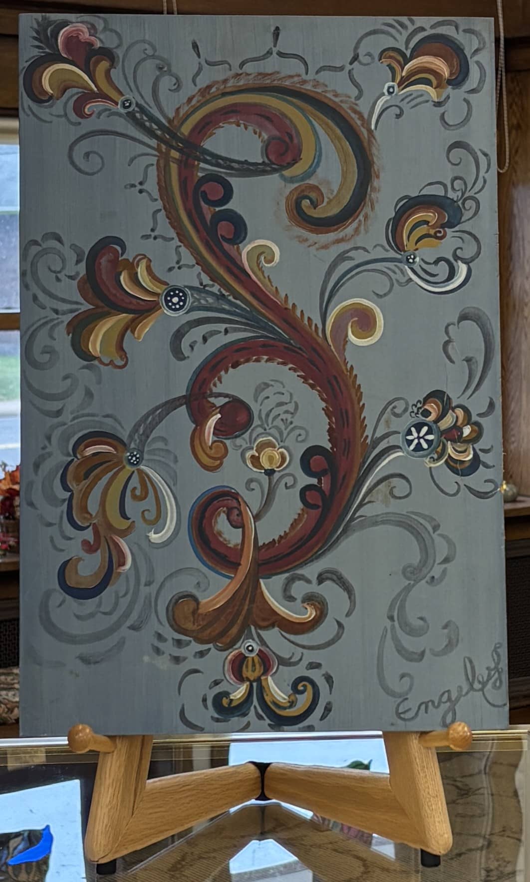 There are many styles of rosemaling that have developed over the years in isolated valleys. Peter particularly likes the Telemark style. According to Rosemaling Coast to Coast, Telemark is “known as the national rosemaling style of Norway. Telemark is one of the most recognizable and popular styles. From a region located in central southern Norway, Telemark rosemaling is known for its graceful, flowing, asymmetrical design made of scrolls and fantasy flowers.”